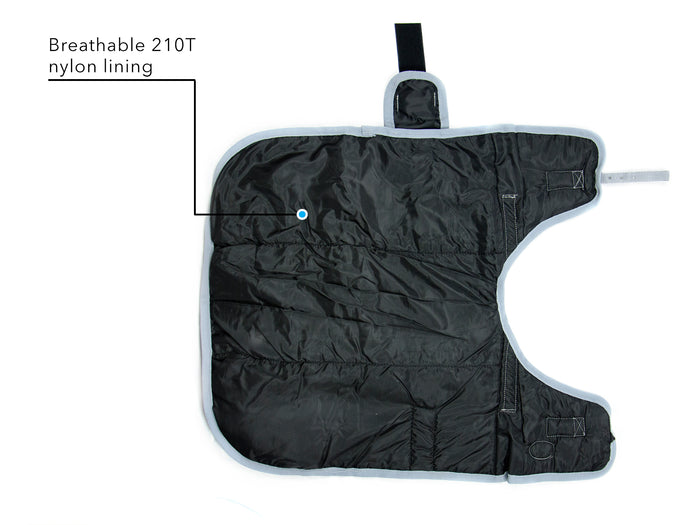 This blanket contains a nylon No Rub 210T inner lining, which is made of a sleek, super silky and soft nylon fabric that was designed to help polish and protect your dog’s hair coat without damaging it. Unlike other materials, our soft 210T lining prevents and won’t cause rubbing, sore spots, and fur damage. Instead, this soft lining will help keep your dog’s fur coat looking shiny and healthy, while preventing hair damage, tangles, mats, and other common issues that can arise from friction and pressure on your dog's fur.