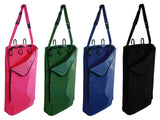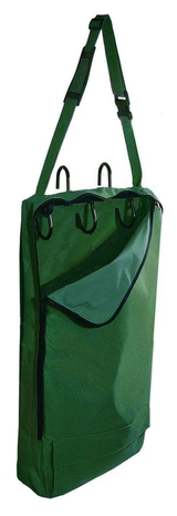This heavy-duty nylon halter/ bridle carrier is equipped with an interior 3 hook tack rack. The exterior hooks allow this bag to be hung over a stall, fence or trailer.