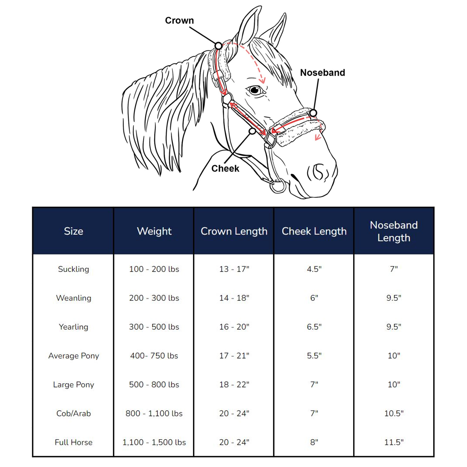 - AVAILABLE IN 7 SIZES TO FIT MOST HORSES - our halters are available in Suckling (100-200 lbs), Weanling (200-300lbs), Yearling (300-500lbs), Average Pony (400-750 lbs), Large Pony(500-800 lbs), Cob/Arab (800-1100 lbs), and Full Horse (1,100-1,600 lbs).