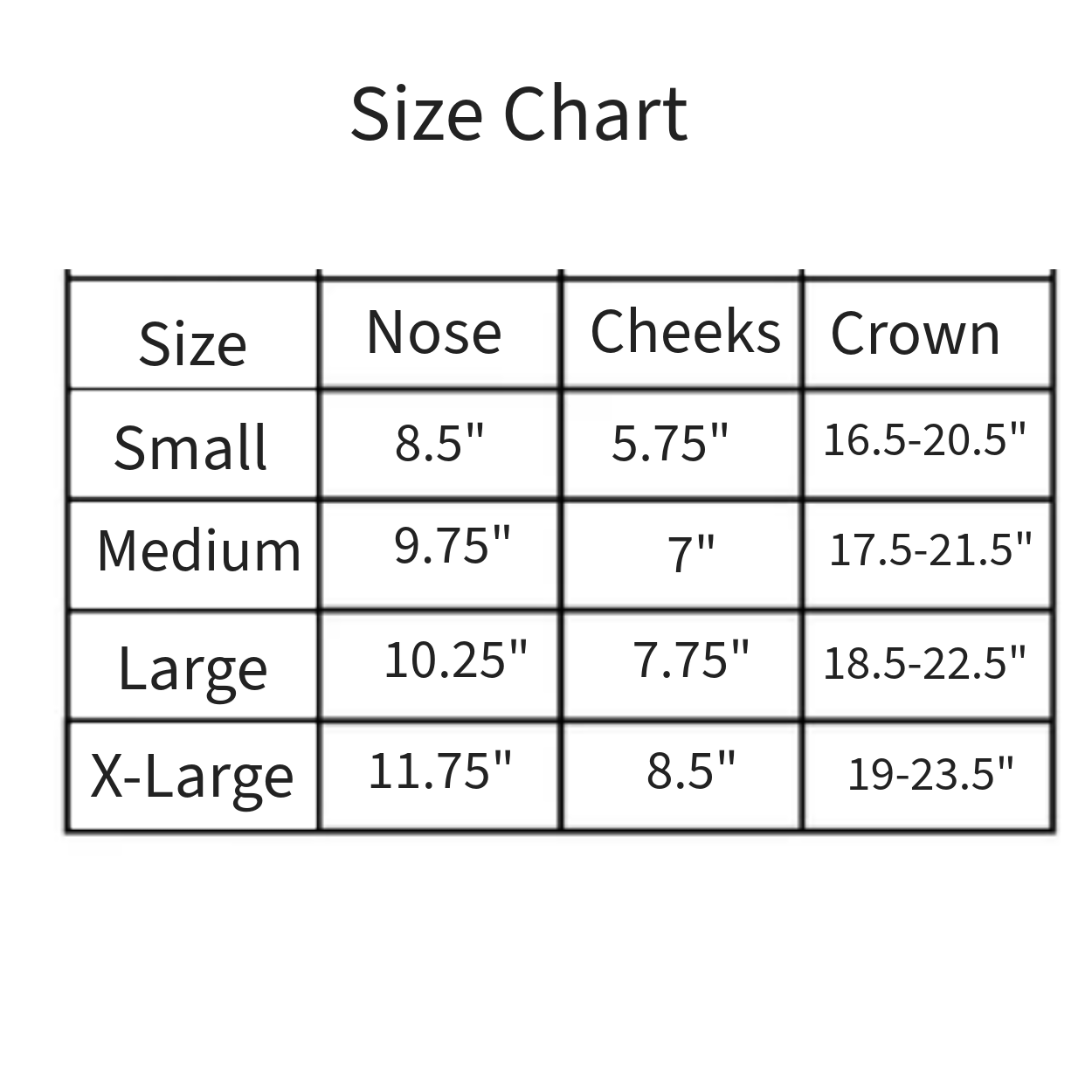 X-Large: 11.75" Nose, 8.5" Cheeks, 19-23.5" Crown