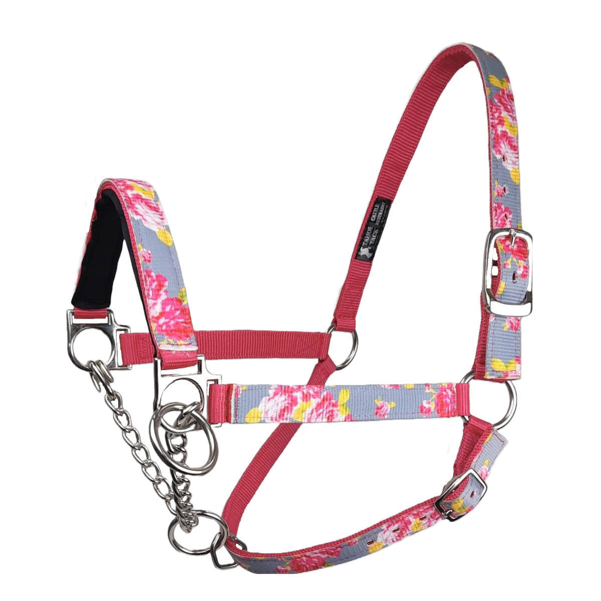 • AVAILABLE IN 4 STUNNING PATTERNS - these premium cattle halters are available in four options to best suit your taste: Blue Aztec print over Black nylon, Red Aztec print over Red nylon, Paisley print over Grey nylon, and Grey Floral over Hot Pink nylon.