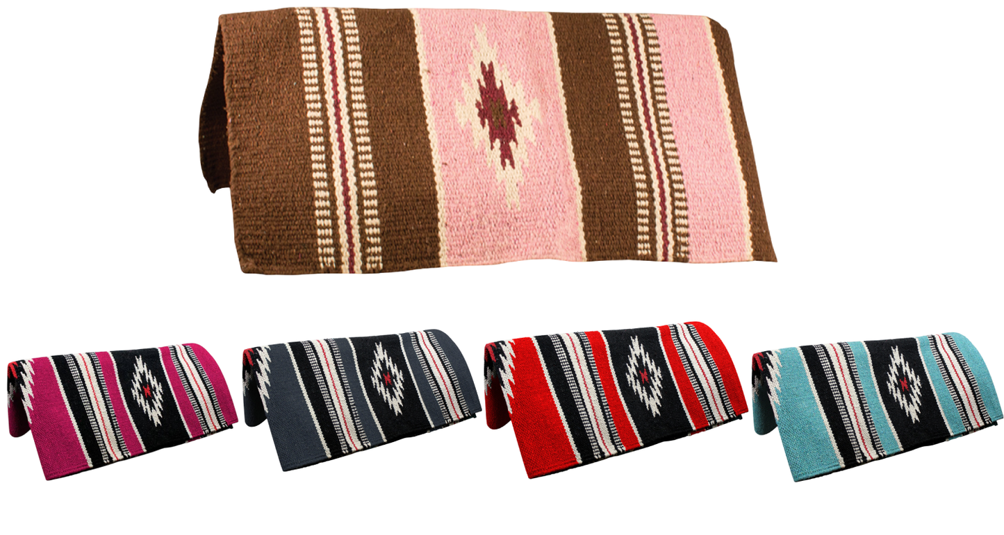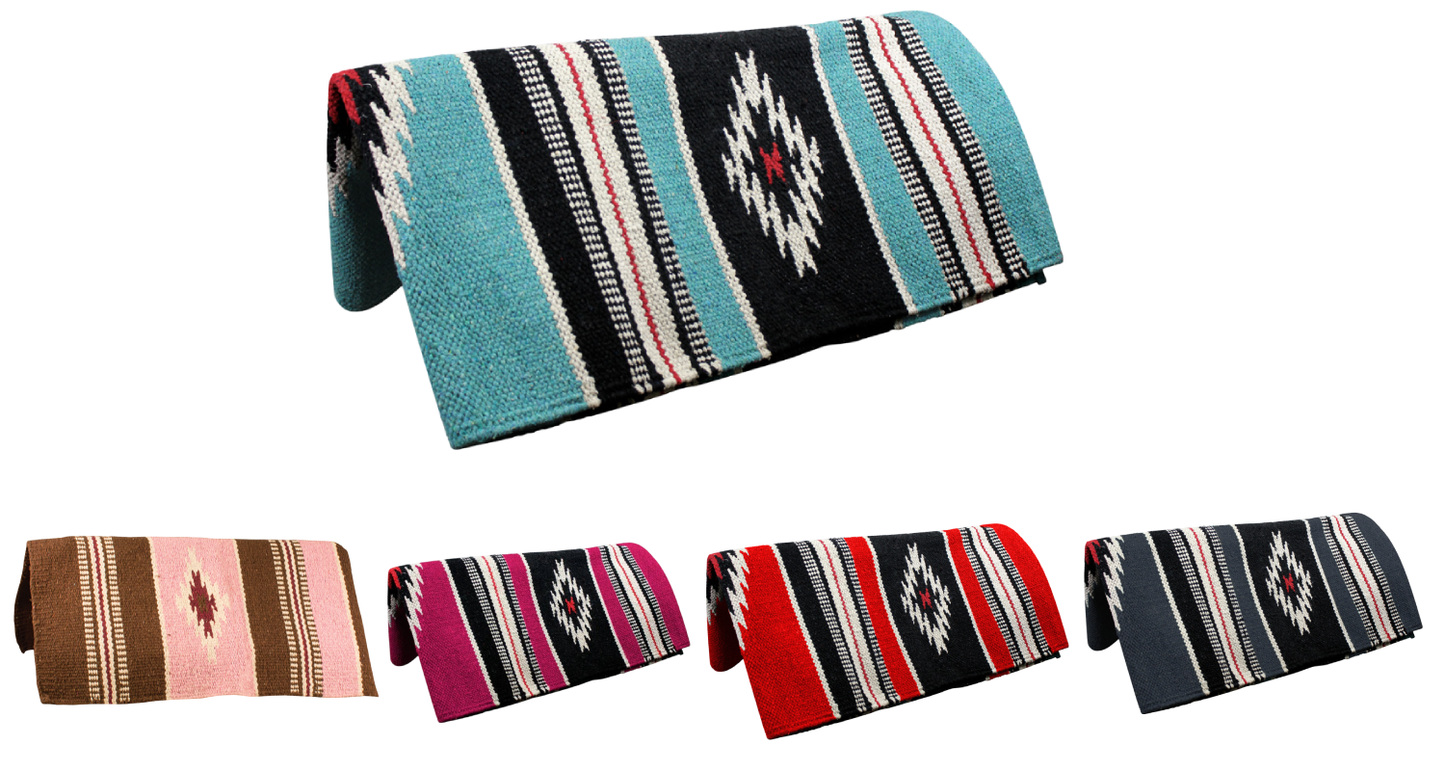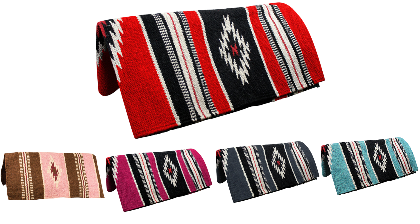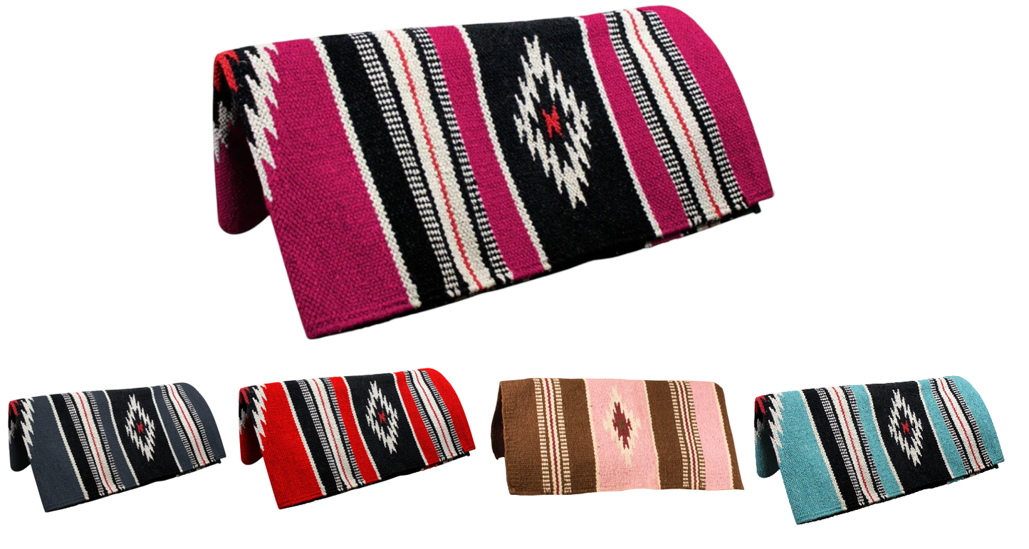Tightly handwoven Navajo design made with high-quality acrylic material. Size: 32" x 64" Hand wash and hang dry only. Navajo saddle blankets can also be used as rugs, seat covers, or even wall decor at home! Tightly hand woven acrylic saddle blanket comes in a variety of appealing colors. The Ancient Navajo designs is very popular, available in many color combinations.
