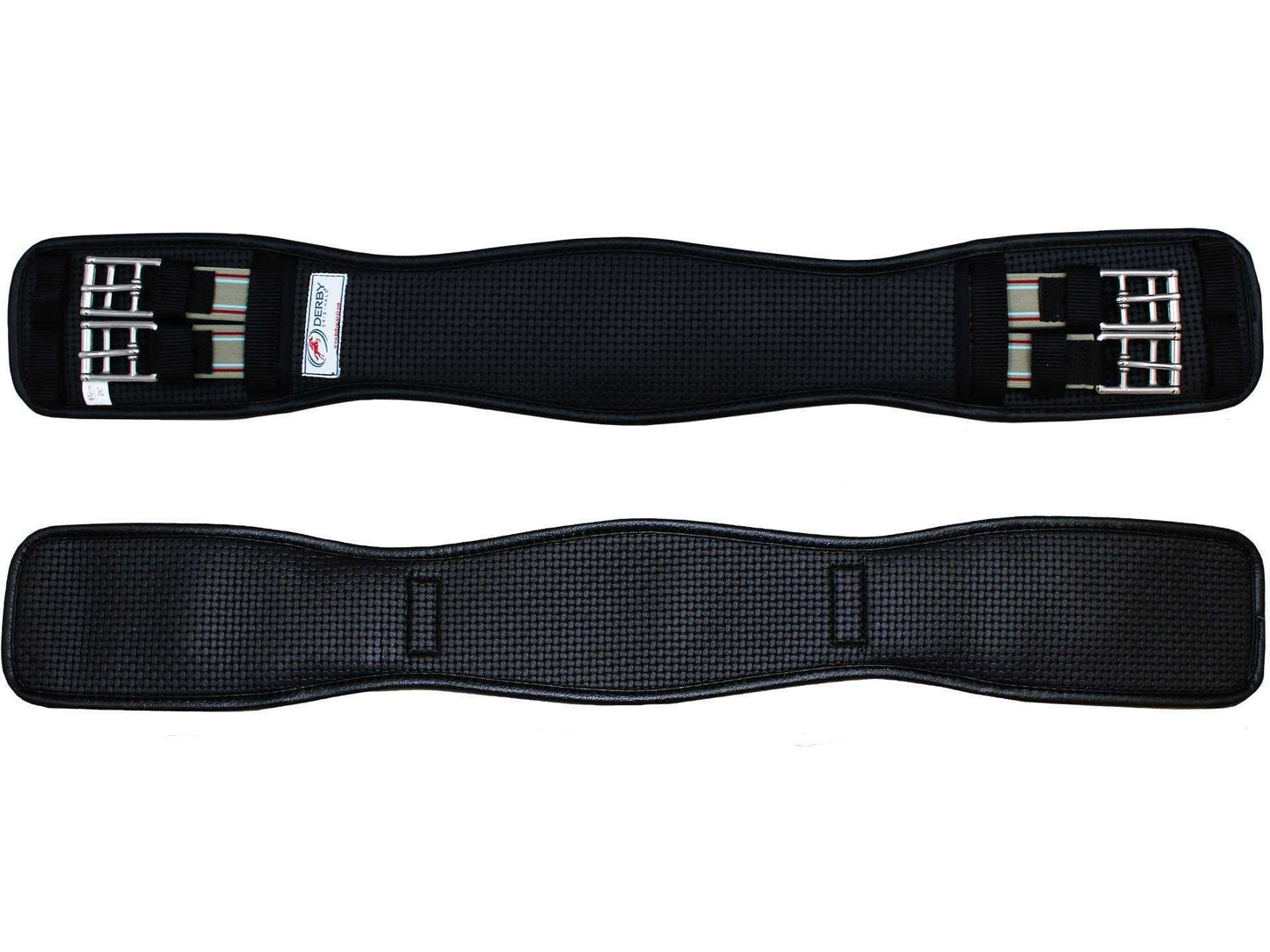 One of Derby Originals most advanced Dressage girths. Designed with your horses health and comfort in mind, this girth features Derby Originals Air Tech textured breathable material to ensure constant air flow during riding and prevent rubs and sores associated with traditional leather girths. The contoured shape of the girth and innovative sponge like material adapts to the shape of your horses girth area to not only keep it in place but to prevent painful pinching. Additional key features include durable elastic on both ends for a comfortable, snug girth fit and stainless steel roller buckles for easy adjustment. Can be cleaned easily with a damp towel, comes in a traditional black color suitable for dressage, and billet keepers for a smooth, seamless look. A must have for every equestrians tack collection.