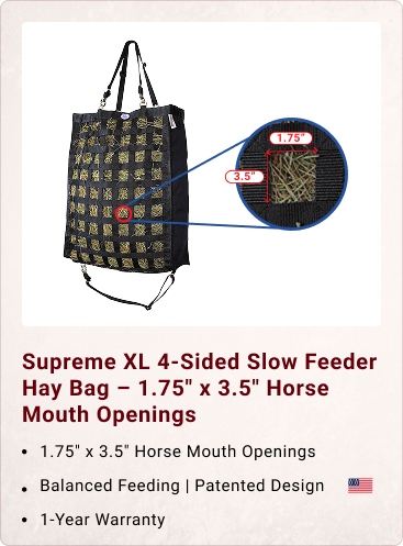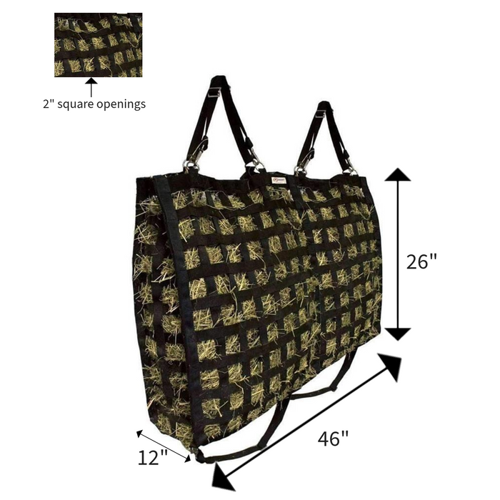 THE IDEAL SLOW FEEDER - this 46"x26"x12” hay bag features uniform 2” square openings which allow your horse to eat comfortably at a more natural pace that mimics grazing. Our hay bags are ideal for helping to prevent colic or digestive upset.