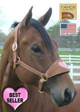 Tahoe Tack’s Basket Weave American Leather Heart Inlay Bronc Halter is a uniquely designed ostrich print leather heart inlay bronc halter that is made from high-grade American leather by Wickett & Craig. This opulent halter features a basket weave design that is hand-tooled by skilled leather craftsmen for a stunning finish. Our halters are available in three heart inlay colors: Pink, Lime Green, Purple, and Sky Blue.
