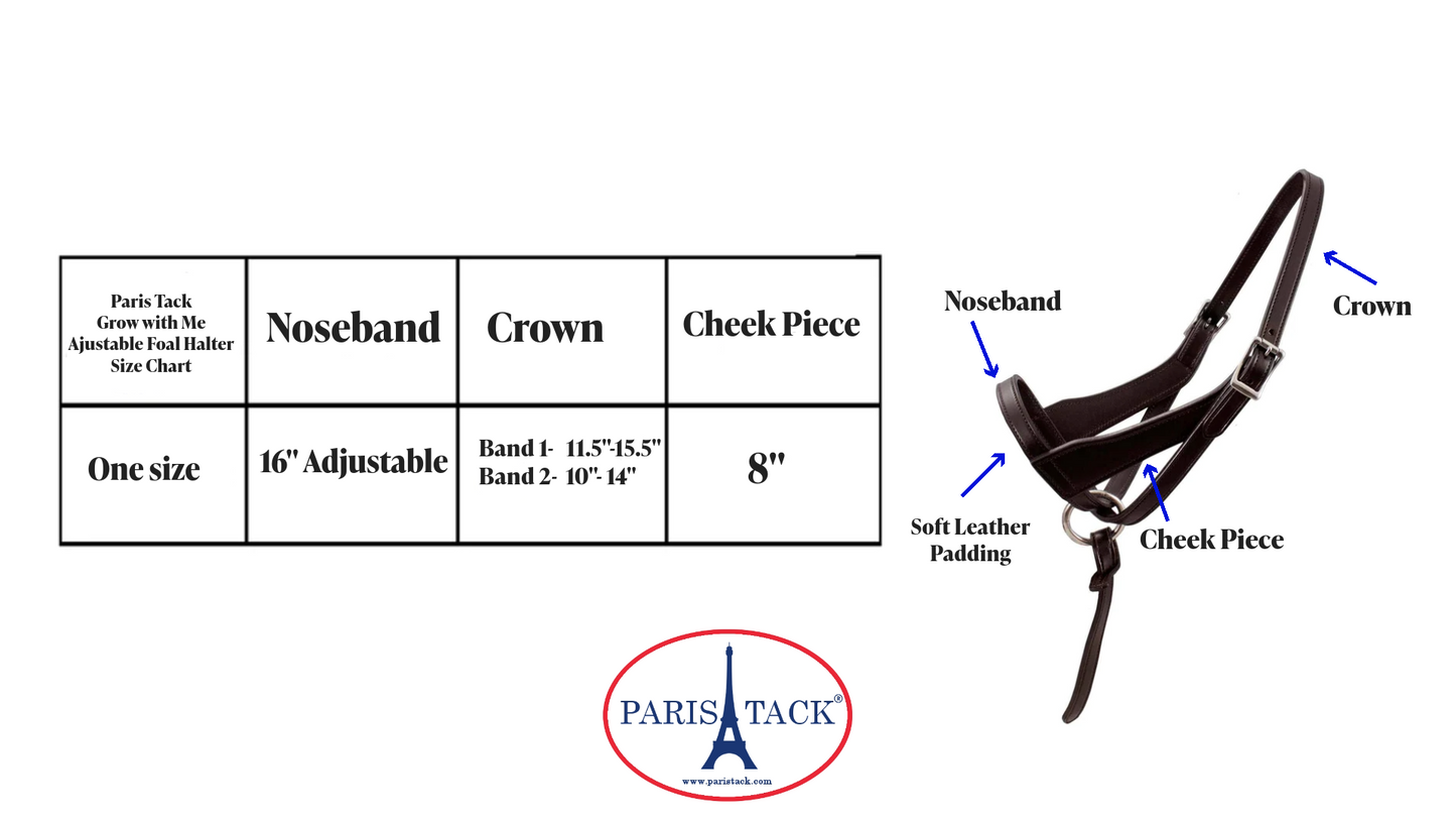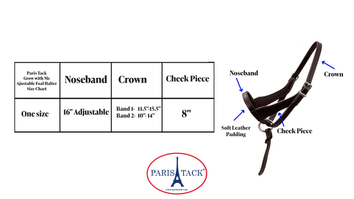 - INCLUDES TWO CROWN PIECES - Paris Tack's grow with me halter comes with two sizes of crownpiece so that you can adjust the halter to fit most foals from newborn to weanling size.