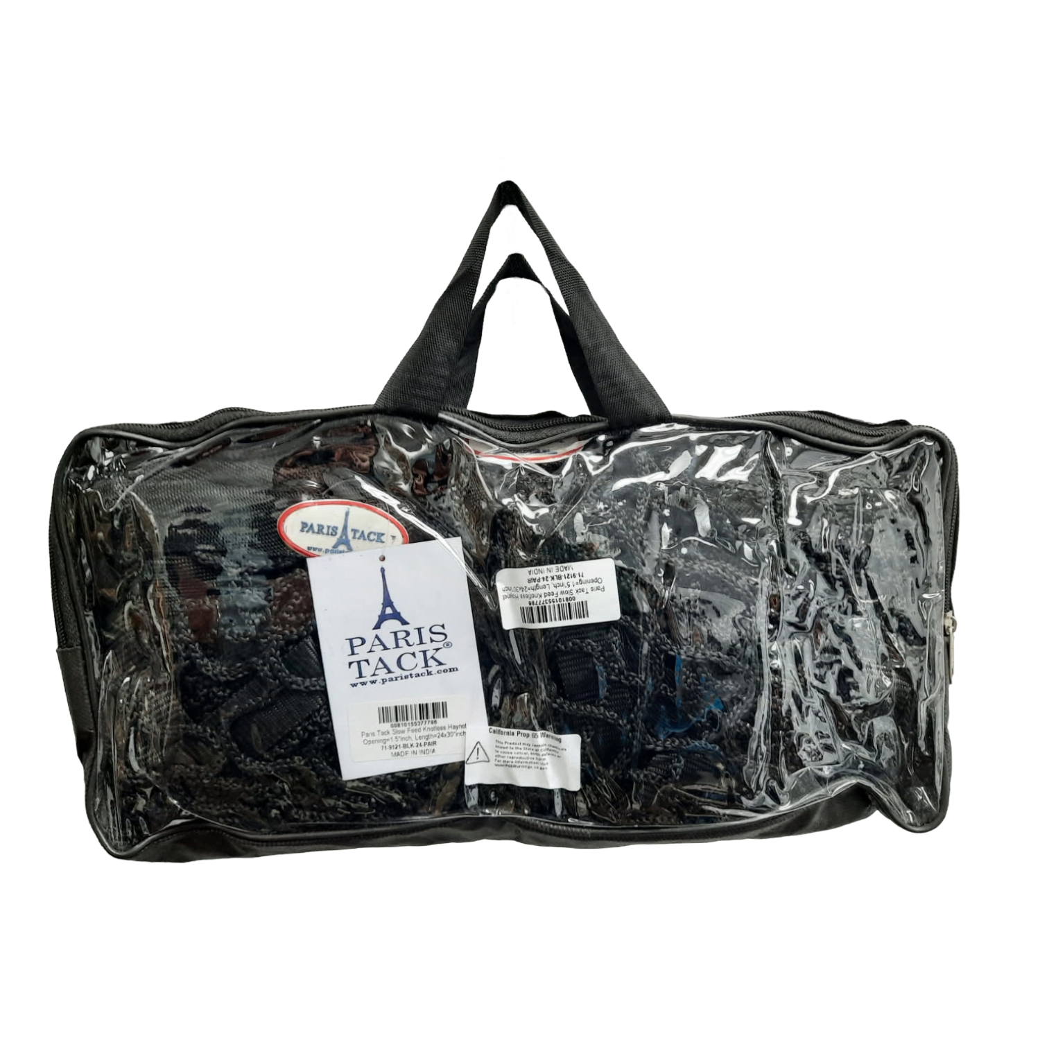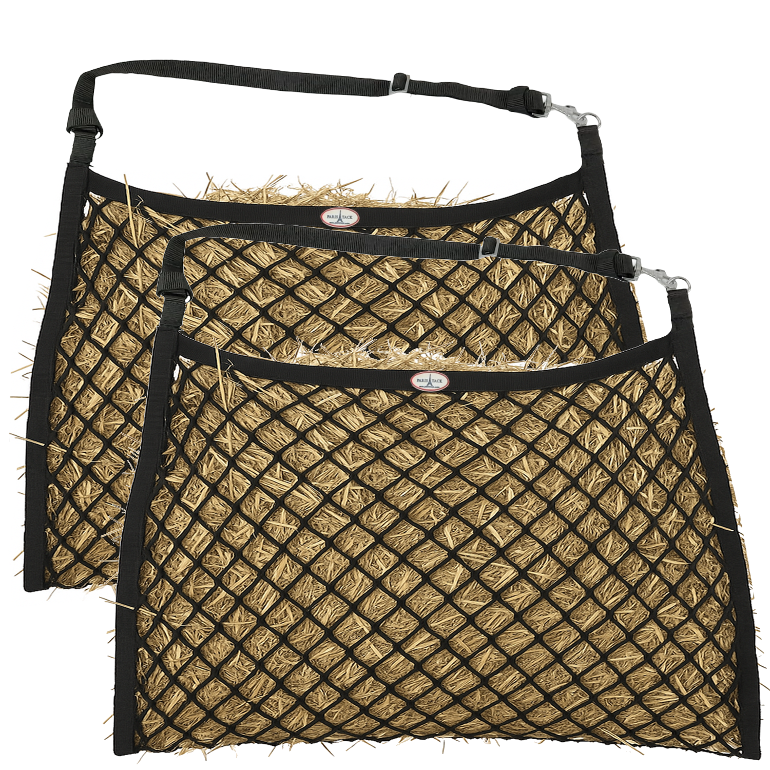 - Set of 2 Knotless Hay Nets – Includes two 24" x 30" ultra slow feed hay nets, each with an adjustable hanging strap and snap for quick, secure attachment in stalls or trailers.
