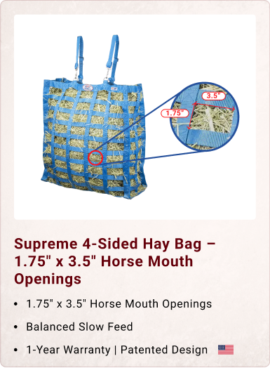 . Our four-sided hay bags are the only bags on the market that allow your horse to freely eat from any part of the hay bag. These patented hay bags are the result of years of careful study and testing to create a design that is attractive, functional, durable, high-quality, and preferred by horses. Our bags are constructed of reinforced nylon webbing that is stronger and more durable than any mesh or fabric hay bag. These bags are designed with cross stitches at every intersection and bartack stitching at all stress points along the top, sides, and bottom of the bag. This hay bag also features our exclusive Super Tough Bottom®: a grid of reinforced nylon webbing that will never rip like solid or mesh bottoms. Our bags are built tough from premium materials and are designed to last for years to come. This hay bag is designed to be a great everyday feeder for most horses and other animals: it measures 22"x8"x25" and can hold about 2-3 flakes of hay. This hay bag has 3.5"x1.75” rectangular openings which will prevent hay wastage and slow down their rate of consumption, but still allow for frustration-free feeding. This premium hay bag also includes a 1-year limited manufacturer's warranty offered by Derby Originals.