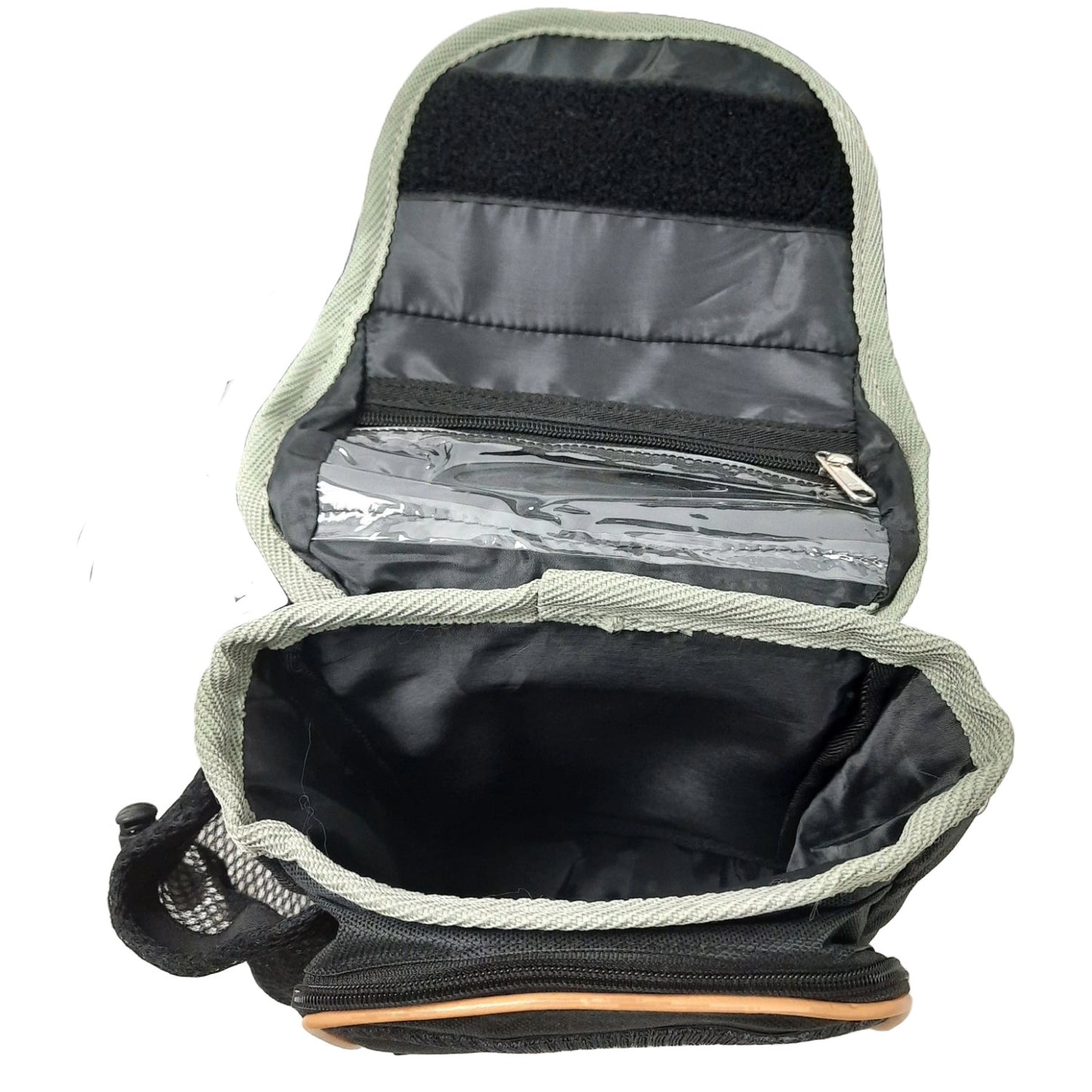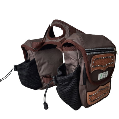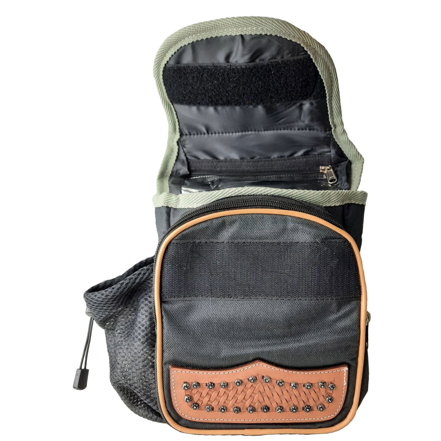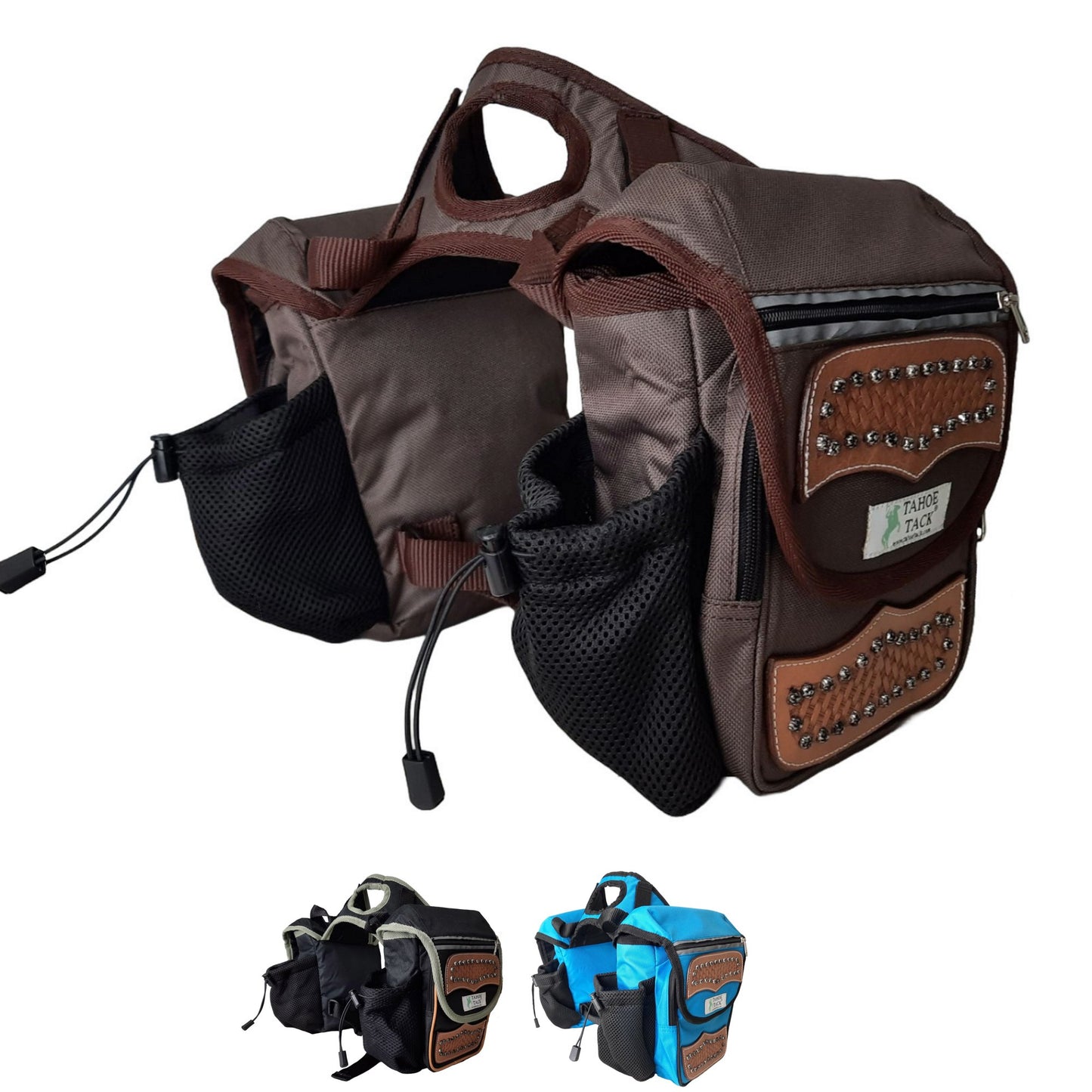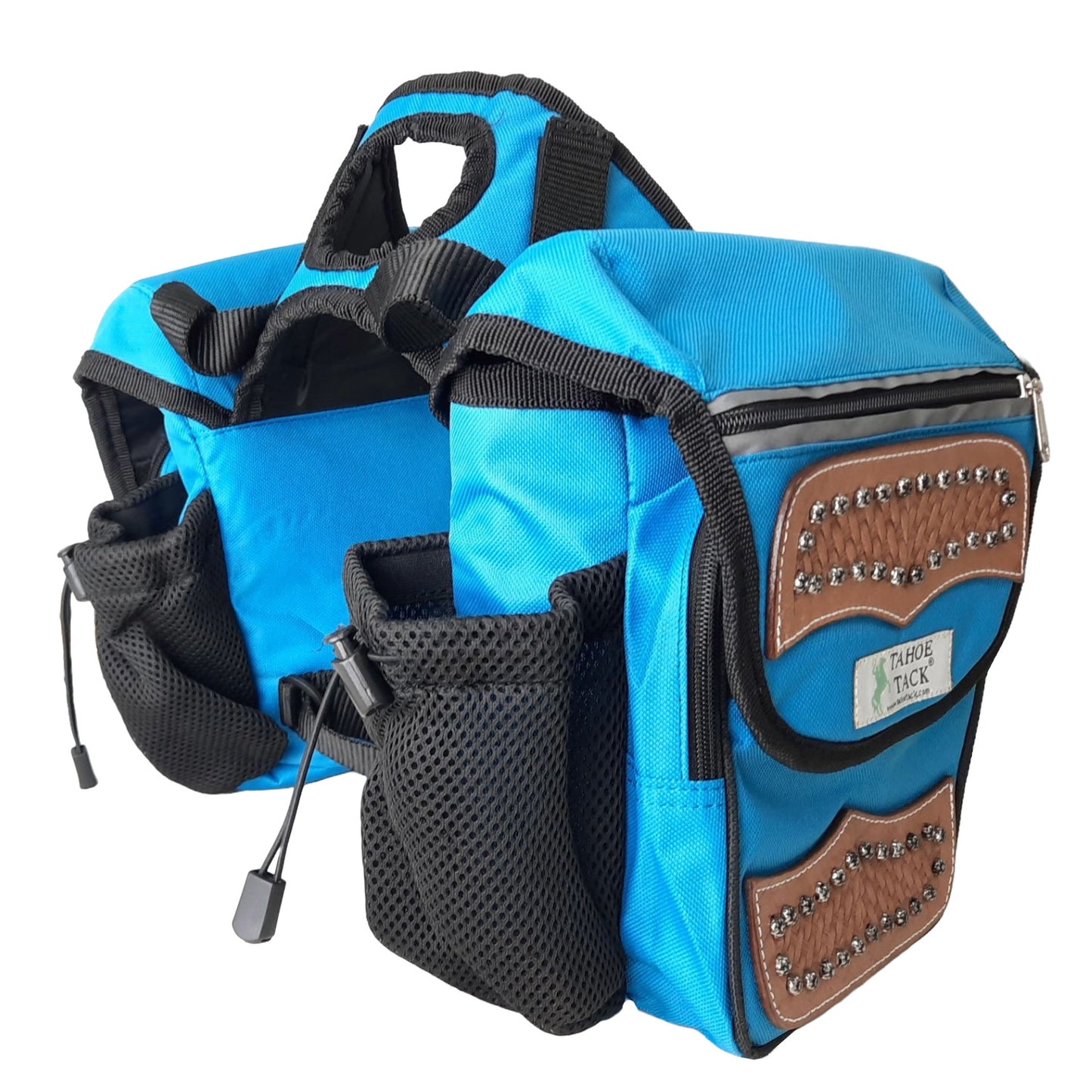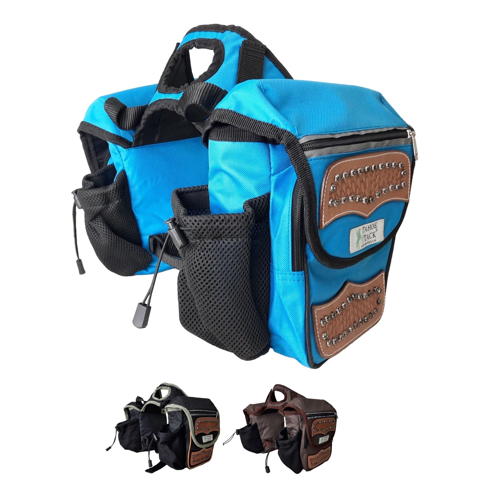 Our horn bag includes a front drawstring mesh pocket on either side that is perfect for holding small drinks like cans of pop/soda. Each side bag includes a zippered full-size front pocket, a large inner pocket, and two smaller pockets located on the velcro flap cover. One pocket is located on the outside, and the other pocket is clear and located inside. All of this easy-to-access storage means that you can easily carry your phone, food/snacks, tack, and safety gear without issue.