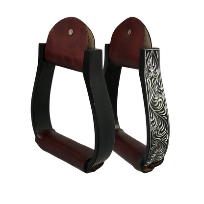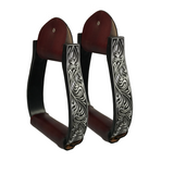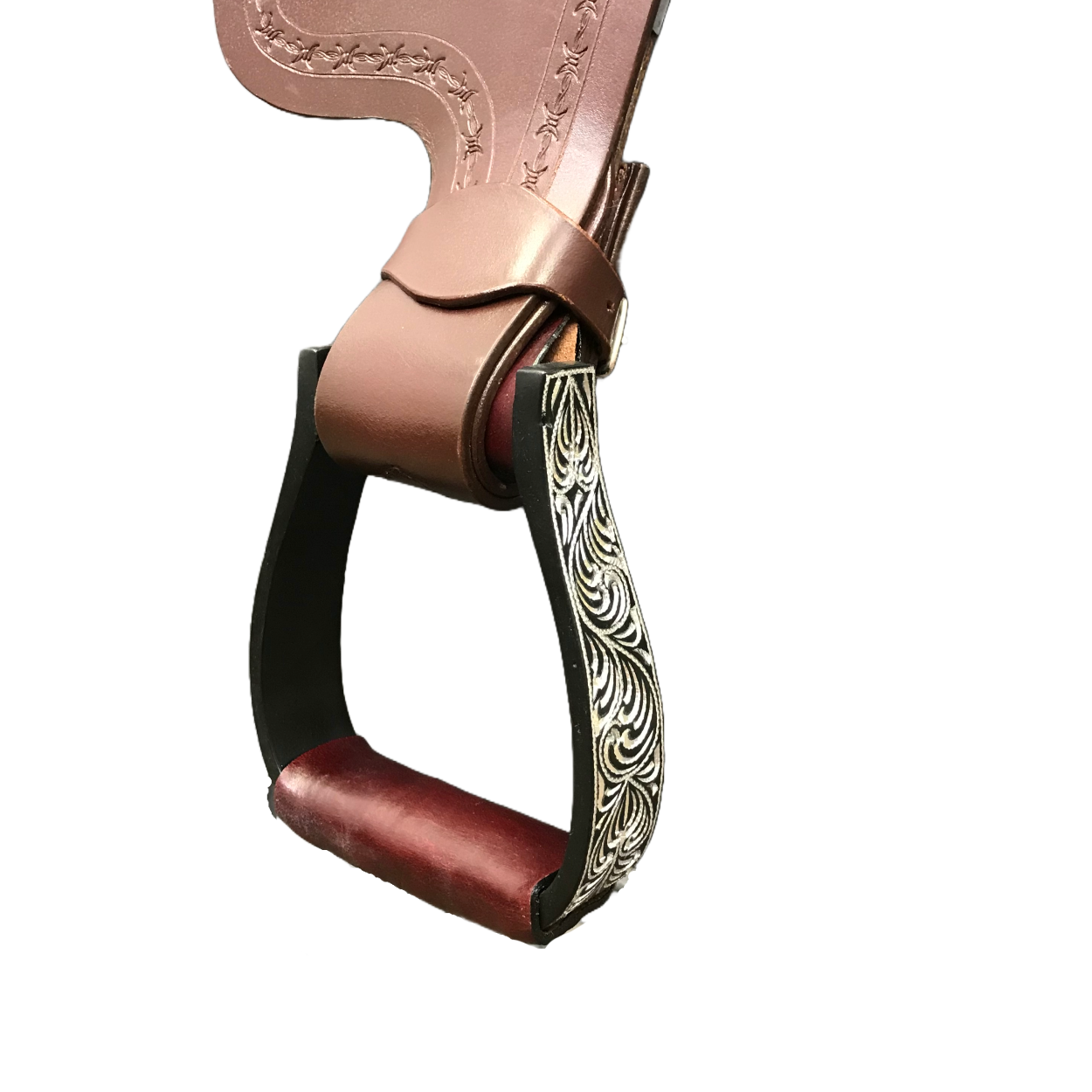 Tahoe Tack’s black engraved wetern stirrups were designed to enhance the overall appearance of a western rider in the show ring. Although these stirrups are beautifully hand engraved, they are not bulky or overly flashy in a way that will distract from the riders performance. They simply add the right amount of elegance to your existing tack set. These stirrups only feature the engraved design on one side of each stirrup and are sold in pairs. The color/shade of the leather pieces on these stirrups may very slightly from lot to lot.
