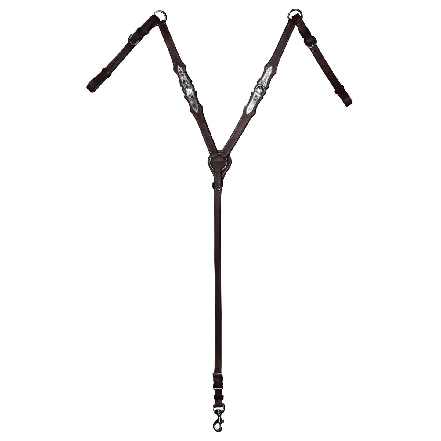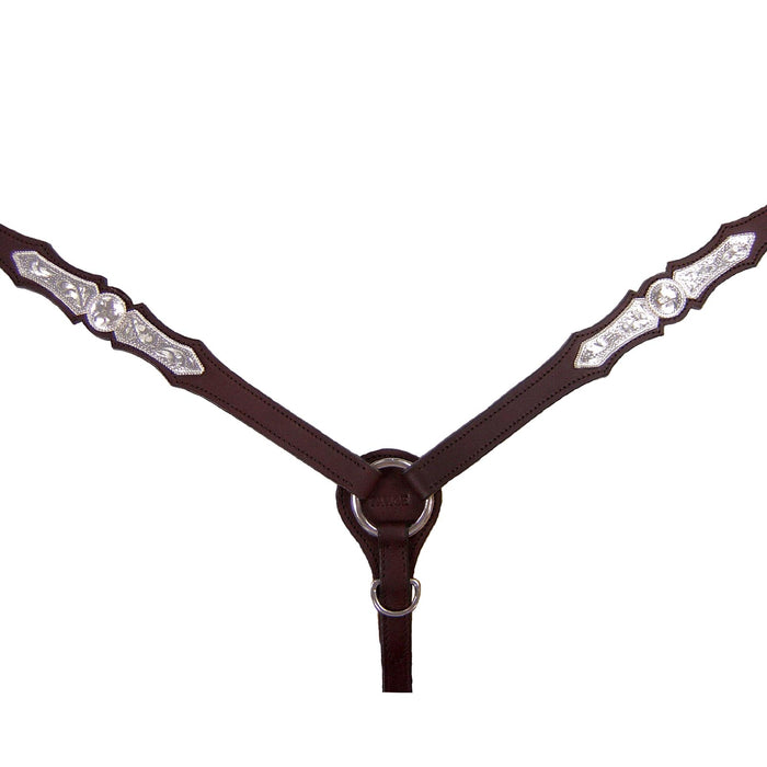 This breast collar is made from top quality double layered leather, is double stitched with hand-finished edges and dazzling silver work!