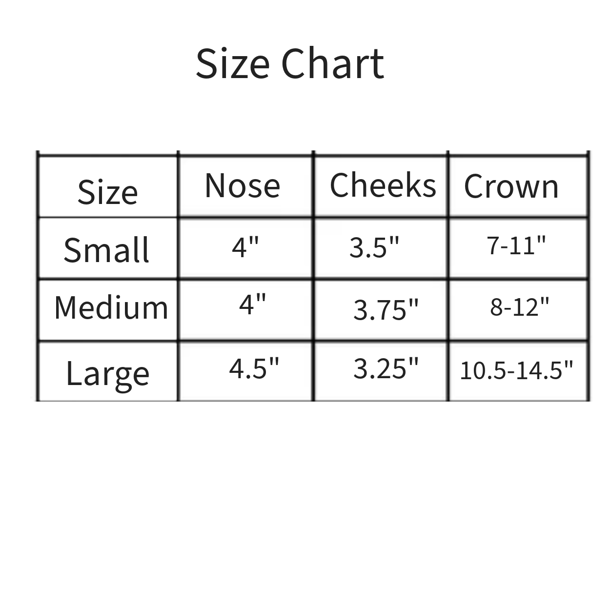 Large: 4.5" Nose, 3.25" Cheeks, 10.5"-14.5" Crown