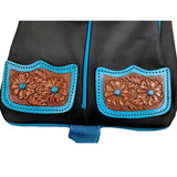 This stunning Western boot bag by Tahoe Tack features hand-painted and tooled floral leather accents dotted with turquoise stones. This stunning, eye-catching design will set you apart from other riders. Our boot bag has a separate zippered compartment for each boot to prevent rubs or scuffs.